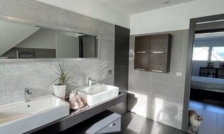 Sect. frontalier, Schönenbuch, Hagenthal, Hégenheim, Allschwil : Magnifique Plain Pied env. 255 m² / grand espace de vie avec hauts plafonds env. 85 m², belle cheminée, 3 sorties sur les terrasses / 4-5 chambres dont 1 master, 3 SdB / combles aménageables. Situation calme & idyllique, proche centre + Bâle, à 10 min du TRAM n°10, idéale frontaliers, international people ! Rez de Jardin / Sous-sol aménagé en logement intégré : vaste entrée représentative, bar avec salle de réception, WC, salle d'eau, 2 chambres d'amis, 2 celliers, cave à vin, 2 garages, chaufferie (au fuel). Jardin magnifiquement aménagé, très soigné. Plusieurs belles terrasses dont 1 surélevée et semi-couverte. Maisonnette de jardin, biotope. Du soleil du matin au soir ! Soigné. Qualité de A - Z ! Règlementation immobilière : Honoraire à la charge du vendeur - Viel Platz + Komfort, gute Qualität und guter Geschmack, das sieht und spürt man sowohl im Inneren wie auch im Außenbereich, im großen, sehr gepflegen Garten und auf den Panorama-Terrassen. Nahe guter bis sehr guter Infrastruktur, ruhig und sonnig, gute Distanz zu wenigen Nachbarn ! Schweizer und deutsche Grenze in 5 - 10 Minuten mit dem Auto. Schöne Südlage, leicht erhöht. Gewachsenes Wohngebiet mit verstreut liegenden Villen, kleinen bewaldeten Wanderwegen. Gepflegter Garten auf ca. 1700 m² Land, mit recht großem Gartenhaus, ggf. ausbaubar. Freier Blick auf das Dorf. Nahe dem Zentrum - das Meiste ist zu Fuß erreichbar. Mit 5 Schlafzimmern (darunter ein Elternschlafzimmer mit Bad), einem sehr großen Wohnzimmer mit Kamin und einem gediegenen Esszimmer mit Ausgängen zu die erhöht liegenden Terrassen, 3 Badezimmern und einer großen, sehr schönen Küche. bietet diese Villa viel Platz für eine große Familie mit Kindern, mit Anhang, für Sie und Ihren Besuch oder um B & B zu starten. Natürlich ist Ihr Zuhause auch bestens für Freiberufler und Homeworker geeignet. Vollausgebauter Par-Terre-Bereich / Untergeschoss, mit Gästezimmer + Bad, 1 Spiel- / Schlafzimmer, Weinkeller. 2 Garagen für 4 Autos, Ölheizung, 2 Vorratskammern. Alles auch rollstuhlgängig ! Großer Dachboden mit der Möglichkeit, dort noch mehr Wohnraum zu schaffen. Das Haus ist auch leicht in 2 unabhängige Wohneinheiten teilbar. Das idyllische, professionell angelegte Grundstück mit mehreren Terrassen ist ein wahrer Traum ! Biotop- Kurz : eine Villa mit Qualität von A - Z in einer Vorzugs-Lage ! Ruhe, freier Blick, viel Sonne und angenehme Schattenplätze im Sommer - dies alles nur wenige Gehminuten von Wiesen, Wäldchen und Feldern entfernt ! Ca. 7 - 10 min bis schweizer Grenze / Biel-Benken. Laufen Sie gemütlich zum Bäcker, Metzger, zum Kindergarten und der Schule, zum neuen Colruyt Supermarkt, zur Bank, zu Restaurants. Nahe Distri-Bushaltestelle und rund 7 - 10 min von Haltestelle Tram n° 10 in Leymen nach Basel und der Tram in Saint Louis nach Basel, zum Bahnhof., zu den verschiedenen Autobahnen und übern Rhein nach D. - Near Basel and Leymen, a huge villa consisted of 2 living levels, is awaiting you ! Located at the brim of a nice village, surrounded by a magnificent land and garden of 1.700 m². Very sunny and quiet environment near good amenities and small forests, meadows and fields. You have 5 bedrooms (including 1 master with a bath), 3 bathrooms in all, a big living and a dining room is the centre of the house as well as a fantastic kitchen. 3 access to the outside and onto the garden. At rez-de-jardin-level is an independent apartment - a large converted ground floor, with a bar and reception room. In the attic you got more potential to create additional living space. Garages, cellars, wine cellar are at rez-de-chaussée level, including an attached double garage. Beautiful landscaped garden, several terraces, one covered and one elevated. À biotope, a garden house that you might convert into a guest house. What more do you need ? Near center, schools, restaurants, backery and shopping. Tramway to Basel at 5 min. Biel Benken / Swiss border you reach just in 5-7 min by car, the airport and mototway in 12 - 15 min. À visit pays!