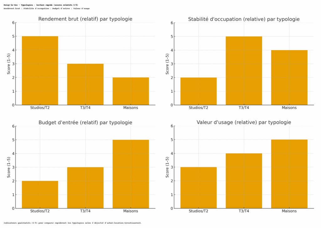 T3/T4 : rendement brut souvent inférieur, mais **stabilité d’occupation** supérieure (familles/couples) — excellent choix patrimonial.