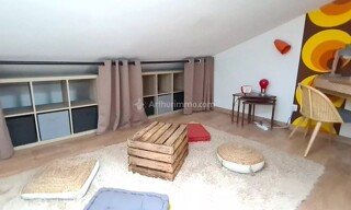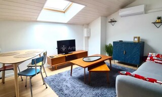 En plein cœur de ville et au 3ème et dernier étage d'un petit collectif, appartement T2 meublé en duplex d'environ 46 m². Sur le premier niveau une entrée avec placard, une grande pièce de vie d'environ 35 m² avec un espace salle à manger cuisine semi équipée (plaque induction 2 feux, frigo-top, micro-onde…) et un espace salon, une salle d'eau avec douche et toilette indépendant. À l'étage, une chambre en mezzanine avec un grand lit, armoire et bureau. Appartement chaleureux ayant énormément de cachet et meublé avec goût. Chauffage par climatisation réversible. Disponible.